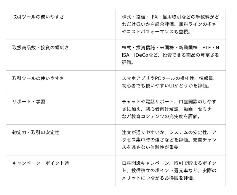これにより、「証券取引のしやすさで選びたい」「投資のは幅広さを重視したい」などの目的別に、ユーザーが自分に最適な選択を行えるようになります。