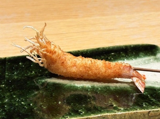 さっぱりした植物性油に限り、油切れのよさを求め高温で揚げる。車海老、半熟うずら玉子、豚肩ロースも定番。