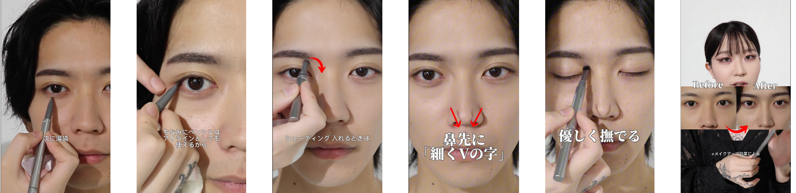 次に涙袋。ペンシルで影を描いてブラシの先端で線を撫でていくとナチュラルに馴染む。ペンシルはアイラインにも活用可能。目尻から少し延長して目元が大きく見える。最後に重要なシェーディング。パウダーを使って鼻の根元に”逆ハの字”鼻先に”細くVの字”で乗せて、ブラシの面で優しく撫でる。1本で目元・鼻元の印象をテクニックいらずで変身可能!