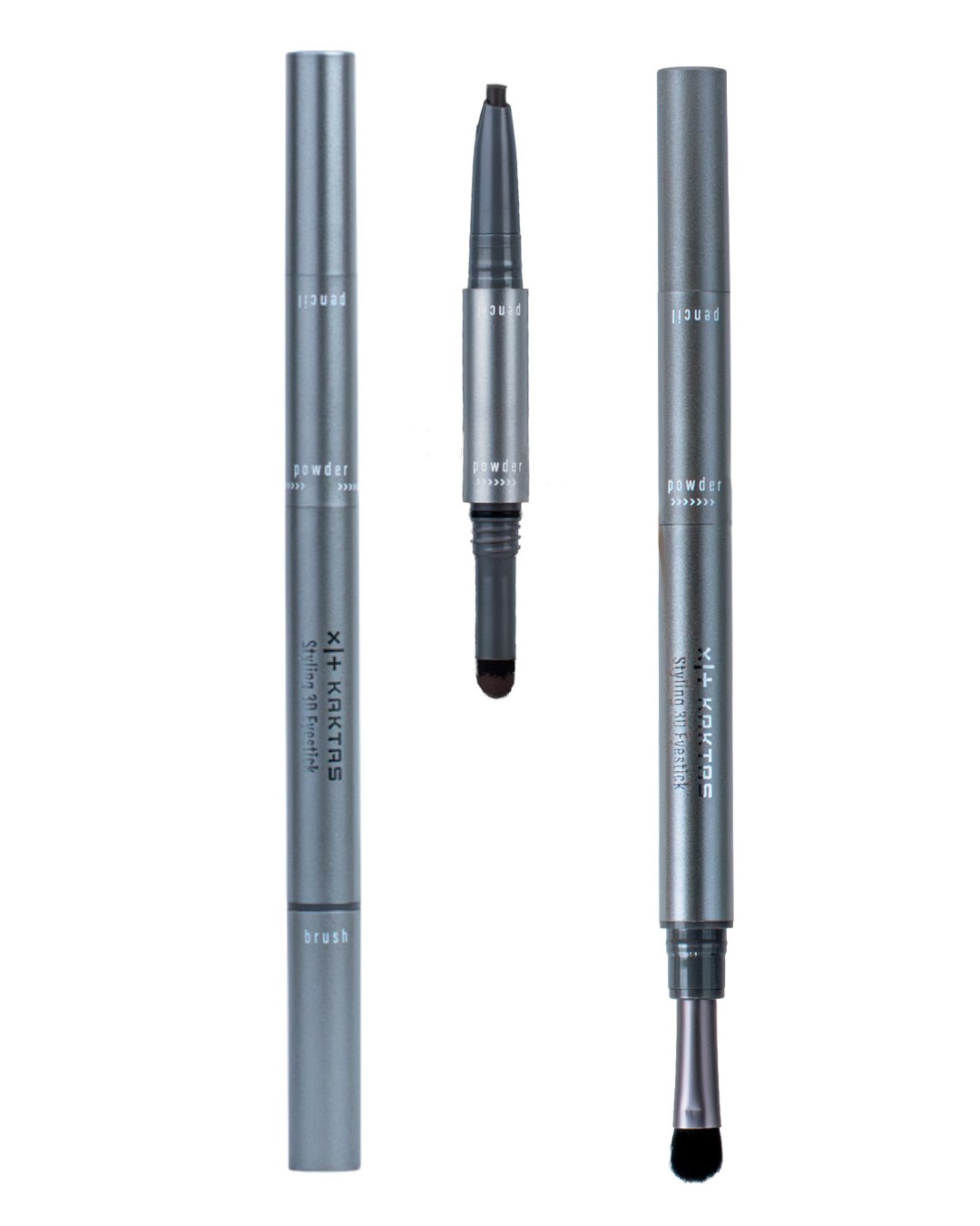 男性の印象を大きく左右する目と鼻の印象を変える1本「スタイリング3Dアイスティック」のご紹介。ペンシルとパウダーに加えて、オリジナルブラシの3Wayを紹介。まずはアイブロウから。パウダーで全体をふんわり埋めて、ペンシルで足りない部分を1本1本描いていく。