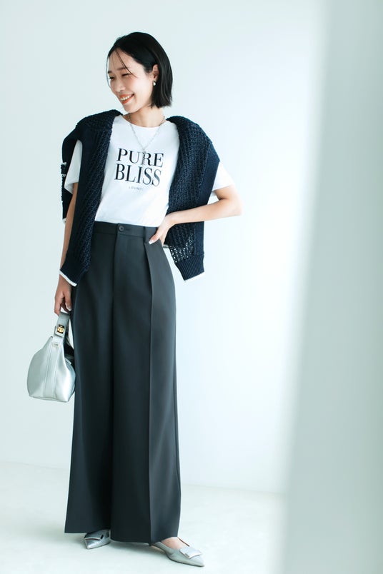 ロゴTシャツとざっくりカーディガンのカジュアルスタイルも、ボトムスにきちんと感のあるパンツを合わせれば、品よくまとまった印象に。
