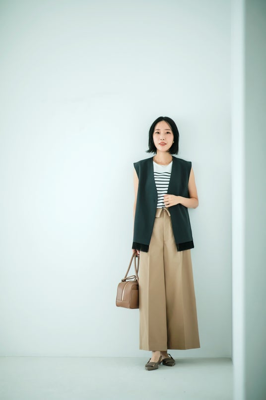 ボーダー×チノパンの着こなしをアップデート。ジレをレイヤードすることで、一気に垢抜けた上級カジュアルが完成。