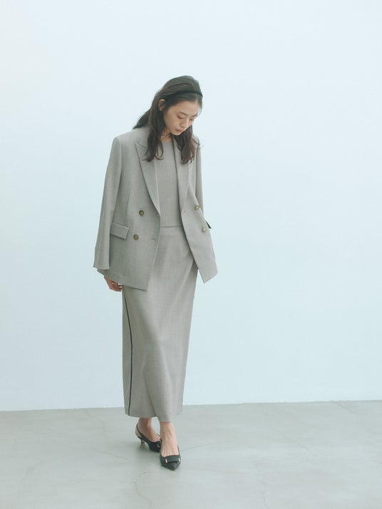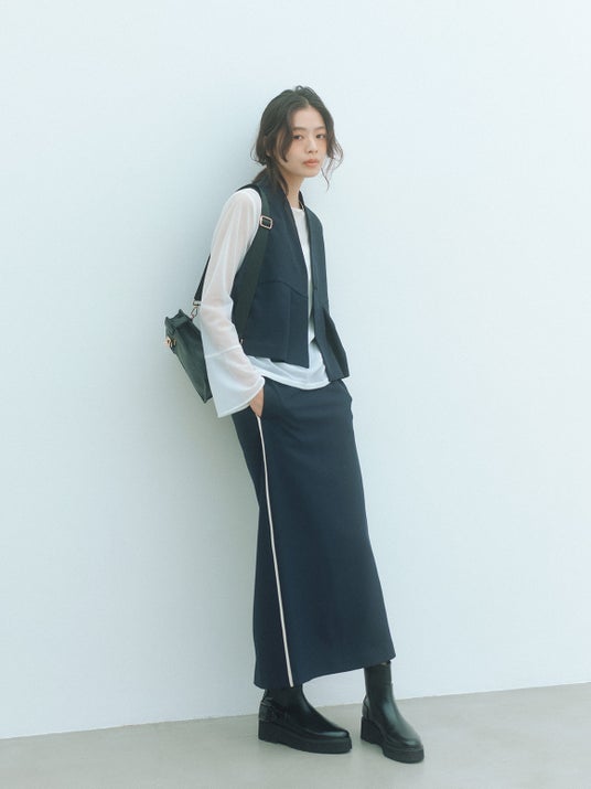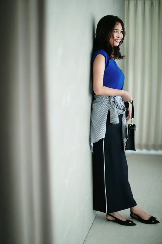 ラインアクセントスカートに鮮やかなブルーのニットを合わせて、知的で洗練された印象に。