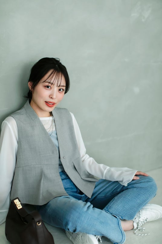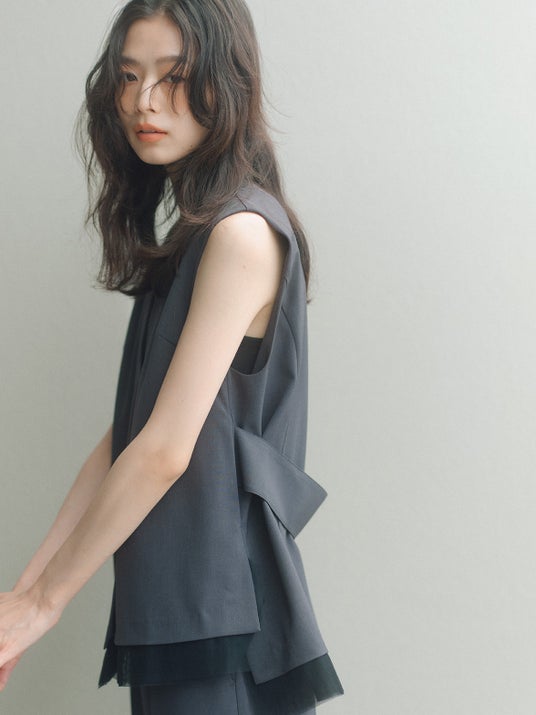 チュールが加わることで、ジレのきちんと感が軽やかな印象に。ストライプシャツとデニムでカジュアルダウンすれば、抜け感のある大人なミックススタイルを楽しめます。