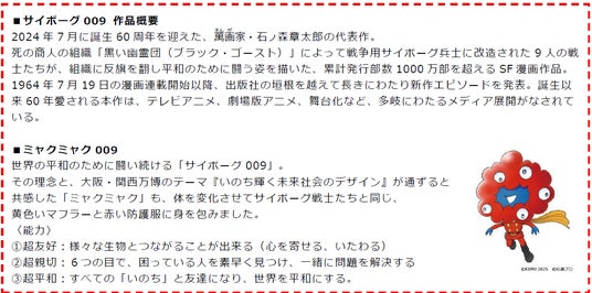今回のコラボレーションは、万博のテーマ「いのち輝く未来社会のデザイン」が、「サイボーグ009」の作品テーマにも通じることから実現しました。本企画のために石森プロが特別に描き下ろしたデザインでは、ミャクミャクが体を変化させ、サイボーグ戦士たちと同じ黄色いマフラーと赤い防護服に身を包んだ「ミャクミャク009」となって登場。誕生60周年を記念した、今ならではの特別なデザインです。