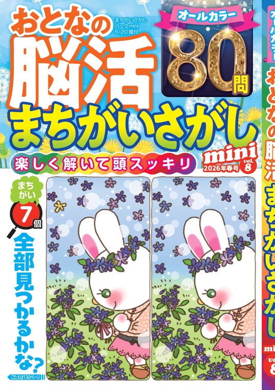 株式会社大洋図書は4月6日(月)に『おとなの脳活まちがいさがしmini vol.8』を発売いたしました。「いつまでも自分らしく、いきいきと過ごしたい」そんな思いをかなえる習慣のひとつが、楽しみながらできる「脳活パズル」です。特に【まちがいさがし】は老若男女問わず、誰もが一度はやったことのあるパズルでしょう。まちがいさがしは単純な作業に見えますが、実際にはさまざまな脳機能が協力して働くことで成り立っており、「観察力」や「集中力」を高める有効な脳トレーニングであるといえます。また、「脳活パズル」は脳だけでなく、心も元気にしてくれる点が魅力です。問題を解いたときの達成感は格別で、集中することで気分転換やストレス解消にもつながります。人と交流しながら考えることは、認知症予防の面でも非常に大切だといわれています。これからの自分を支える小さな積み重ねとして、ご家族や友人と一緒に「脳活パズル」に取り組み、脳にやさしい刺激を与える習慣を始めてみてはいかがでしょうか。