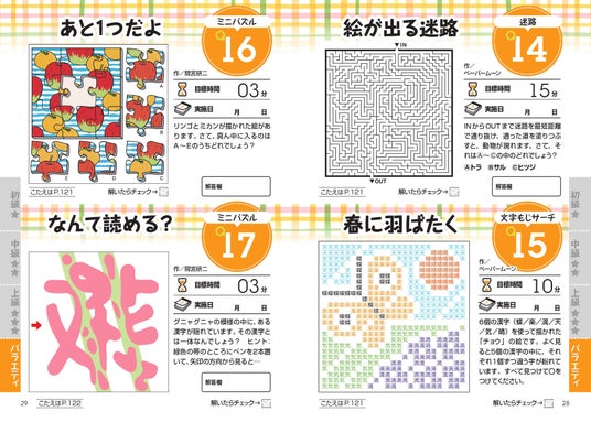 定番の「まちがいさがし」はもちろん、「迷路」「文字もじサーチ」「ミニパズル」など、多彩な脳トレ問題にチャレンジできます。