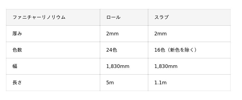 デスクやテーブルの天板はもちろん、スツール、棚やキッチンの面材など、あらゆる家具の仕上げに適しています。水平面だけでなく、垂直面や曲面にも使うことができ、創造の幅を広げます。ファニチャーリノリウムは2種類のサイズから選ぶことができ、長尺の5mサイズを用いて継ぎ目のないダイナミックなデザインも可能です。