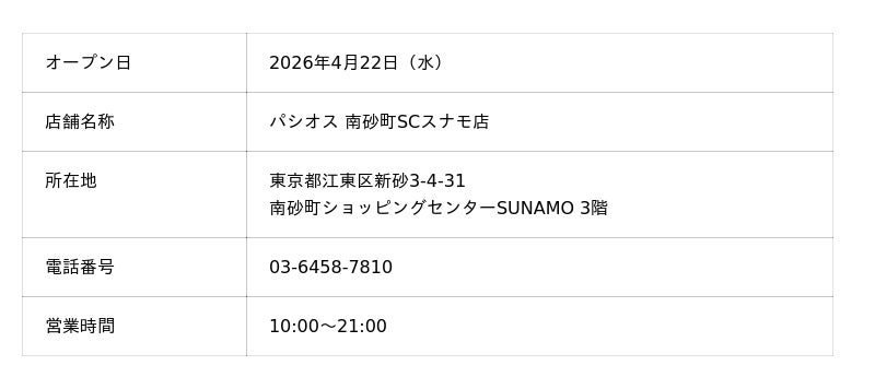 株式会社田原屋(本社所在地:神奈川県川崎市、代表取締役会長:田熊 太郎、代表取締役社長:甲斐 直裕)は、4/22(水)東京都江東区の「南砂町ショッピングセンターSUNAMO」内に、「パシオス 南砂町SCスナモ店」をオープンいたします。