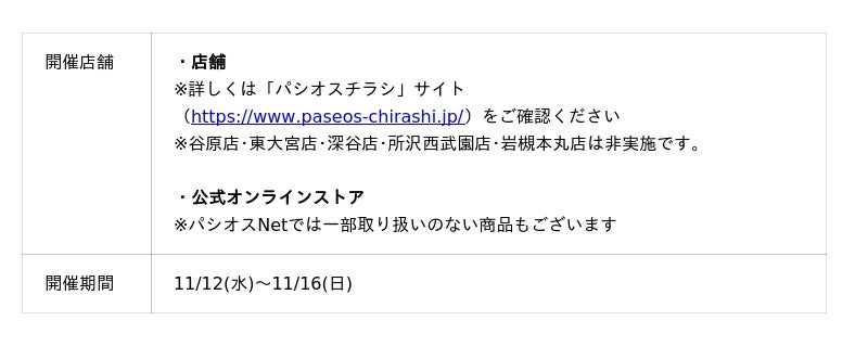 公式オンラインストア パシオスNetでは新規会員登録でのクーポンプレゼントや店舗受取サービスなど、様々な特典をご用意しております。(https://www.paseos-net.com/