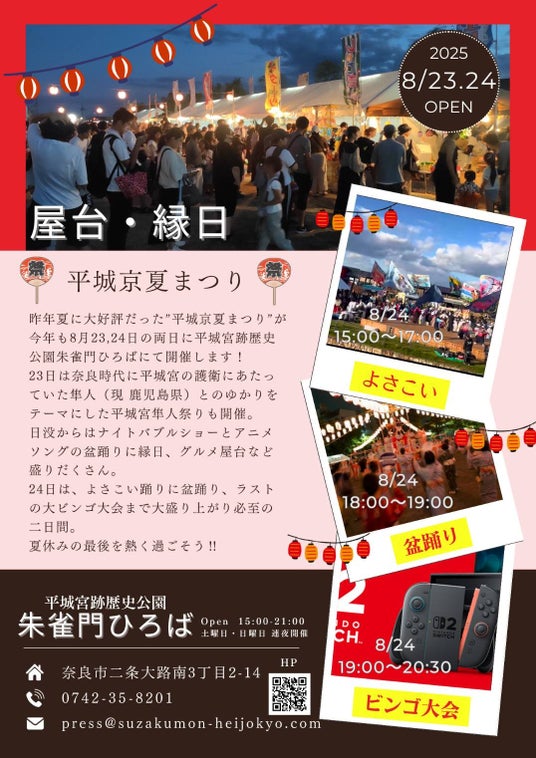 奈良の夏の〆は…平城宮跡歴史公園で家族みんなでエキサイトな夜に盛り上がろう!隼人舞と踊りの宴、アニソン盆踊り、よさこい、シャボン玉Night、豪華景品の大ビンゴ大会、…ワクワクが止まらない!