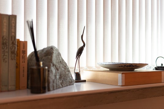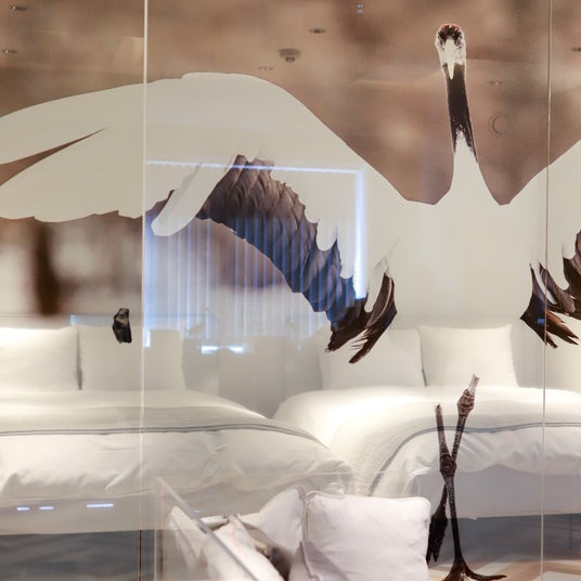 大きな鶴の写真が印象的なリビングスペースから廊下など、施設内の至る所に能面や和皿など40余点の古美術と現代アートを融合展示。時代を超えた造形美がミニマルな空間に溶け込み、一部の作品は購入も可能です。滞在そのものが、まるで美術鑑賞の旅のような体験へと変わります。