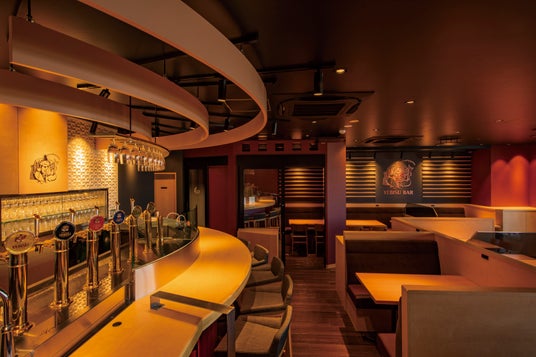 店内は白木調のテーブルや、ゑびす様にちなんだ意匠を取り入れた「和モダン」を意識した空間になっています。ビールサーバーが立ち並ぶ象徴的な円形カウンターでは、グラスに注がれるヱビスの輝きを間近に見ることができ、臨場感とともに特別な気分を楽しめます。
