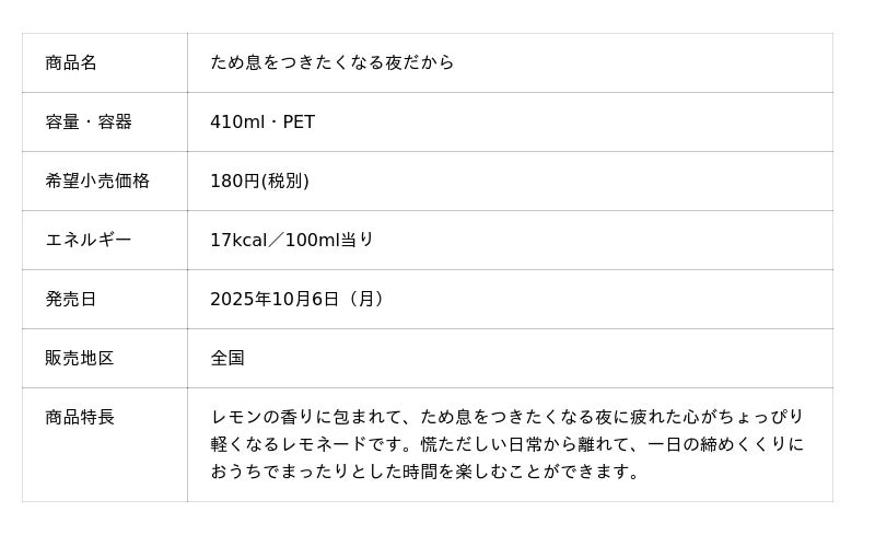また、当社が実施した調査よりレモン飲料は「疲れを癒したいリラックスシーン」での飲用意向が高いことや、約半数以上の女性が「帰宅後の自分時間に有糖炭酸飲料を飲用したい」とのニーズがある事を踏まえ、ターゲット層の心の声に寄り添うレモネード新商品「ため息をつきたくなる夜だから」の商品化を実現しました。本商品は夜の自分時間に飲みたくなる大人向けのレモネードとして「香り×甘味×苦味」にこだわり、開けた瞬間に広がるレモンの香りや、やさしい口当たりで甘さの中にほろ苦さが感じられる味わいをお楽しみいただけます。