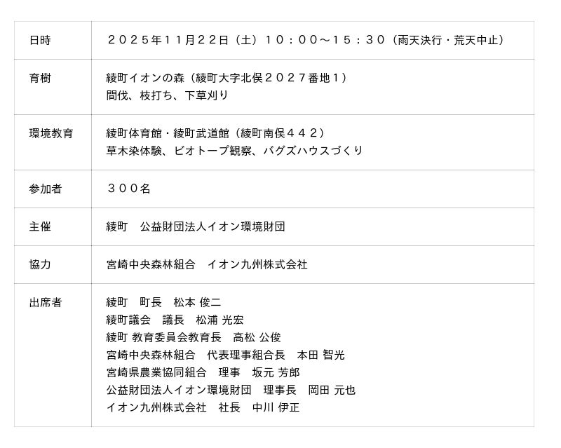 宮崎県東諸県郡綾町(町長 松本俊二)と公益財団法人イオン環境財団(理事長 岡田元也 イオン株式会社 取締役兼代表執行役会長 以下当財団)は、11月22日(土)、「綾町イオンの森」の育樹を実施します。
