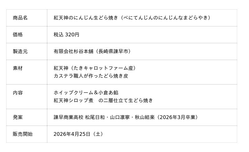 有限会社杉谷本舗(本社:長崎県諫早市、代表取締役社長:杉谷 達成)は、諫早商業高校の生徒が発案した商品アイデアをもとに、長崎県産ブランドにんじん「紅天神(べにてんじん)」を使用した生どら焼き「紅天神のにんじん生どら焼き」を開発し、2026年4月25日(土)より販売を開始いたします。
