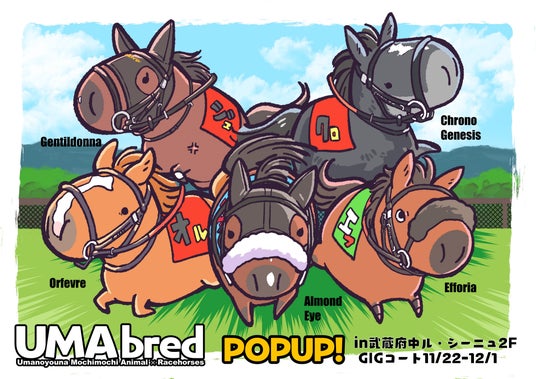実在の競走馬・引退馬を「UMA」(ウマのようなモチモチアニマル)として描きおろすグッズブランド「UMAbred」は11/22より「UMAbred 大集結 ~府中 秋の陣~」と題し、従来のPOPUPよりも小規模なPOPUPを「サテライトPOPUP」として開催いたします。