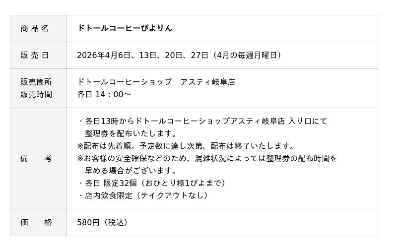 ジェイアール東海フードサービス株式会社(本社:愛知県名古屋市、代表取締役社長:岩下賢一)は、アスティ岐阜東館リニューアル1周年を記念し、「ドトールコーヒーショップ アスティ岐阜店」にて、「ドトールコーヒーぴよりん」をイートイン限定で販売いたします。本商品は、ドトールコーヒーの本格エスプレッソを使用した、ここでしか味わえない限定ぴよりんです。アスティ岐阜東館の節目を彩る特別なぴよりんとして、2026年4月の毎週月曜日に数量限定で販売いたします。