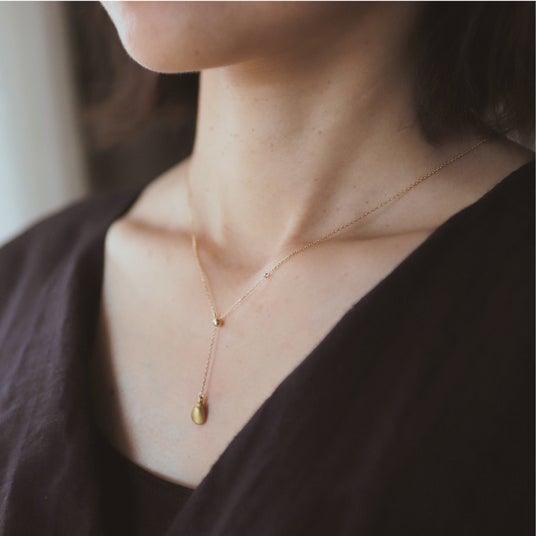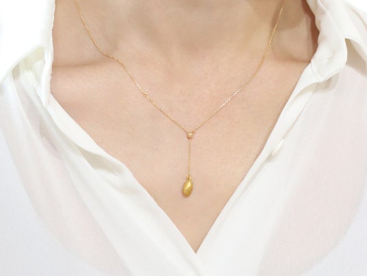 新作ネックレスは、縦ラインを美しく演出する上品なY字のデザイン。純金で精巧に再現された乳歯を、K18の繊細なチェーンと組み合わせることで、控えめでありながらも特別な存在感を放ちます。Y字部分の長さはスライドボールで調節可能なので、ペンダントとしてもお使いいただけます。