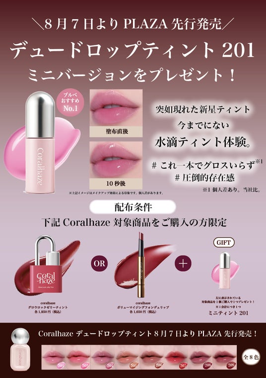 株式会社月架世交易(本社:東京都中央区、代表取締役:文賢宇)は、韓国コスメブランド「Coralhaze(コーラルヘイズ)」の日本正規代理店として、2025年8月7日(木)に新商品「デュードロップティント 8種」を発売いたします。この新商品の発売を記念し、2025年7月24日(木)よりPLAZA一部店舗にて、ミニサイズの「デュードロップティント201」を数量限定で購入者特典として配布いたします。