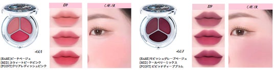 今回の新作リップ&チークアイテムは、3色をひとつのパレットに収め、組み合わせ次第で多彩なメイクバリエーションが可能。質感はマットタイプとグロータイプの2種類をご用意しており、グラデーションを自由自在に演出できます。