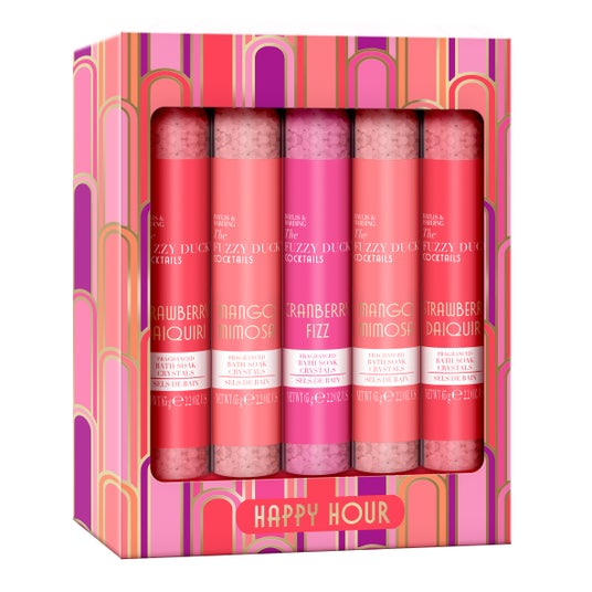 英国・コッツウォルズにたたずむカントリーホテル「Fuzzy Duck(ファジーダック)」で味わうクラシックカクテルからインスパイアされたコレクション。バスルームを華やかで心弾むひとときに。クリアカラーにアールデコ調のゴールドロゴをあしらったボトルデザインは、まるでカクテルグラスのようにきらめき、ギフトシーズンに映える華やかさを演出します。3種類のカクテルをイメージした香りのバスソルトセット、ハンドウォッシュを展開。