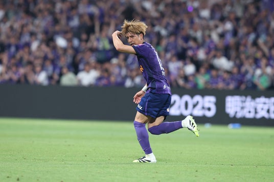いよいよ試合開始。気合の入ったプレーで試合を進めるサンフレッチェですが、名古屋のエース、マテウス・カストロ選手にゴールを奪われ、2点ビハインドでハーフタイムに入ります。