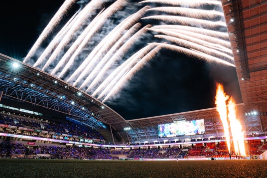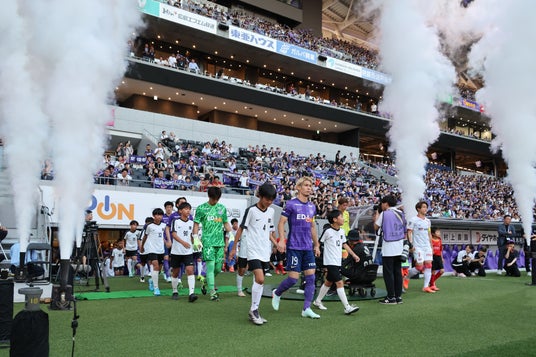 サンフレッチェ広島オリジナルチャントメドレーにペンライト、特効演出、花火が連動する光景は圧巻。