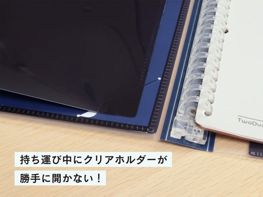 【見開きクリアホルダーつき】表紙の内側に名刺やふせん、封筒や領収書などの細かい紙類を収納できる見開きクリアホルダーつき