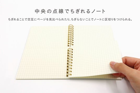 ページ中央の点線でちぎることで、ページを交互に見比べることができ、ちぎらないページがインデックスのように自然な区切りの役割を果たすノートです。