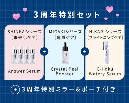 目的別に分かれた3シリーズの美容液を使い分けて試せるセットをご用意。さらに、3周年記念の特別ノベルティも付いてくる3周年でしか買えない豪華セットをご用意いたしました。