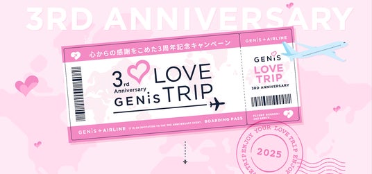 株式会社Elevate(東京都渋谷区)が展開する、宮崎麗果・黒木啓司が手がける美容・健康商品ブランドGENiS Professional(ジェニス プロフェッショナル)は、ブランド誕生3周年を記念し、特別サイト『3rd Anniversary LOVE TRIP』を2025年8月28日(木)より公開いたしました。また、GENiSより愛を込めた3周年として“LOVE TRIP”をテーマに、5つの期間限定企画を2025年9月1日(月)より実施いたします。