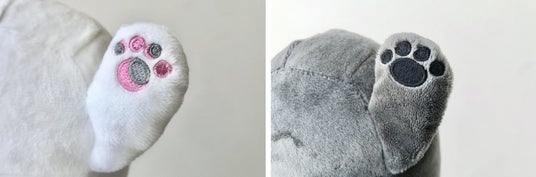 「三毛」「黒猫」どちらも、刺しゅうで表現した肉球がかわいいポイントです。「三毛」の肉球は、実際に三毛猫に多い2色がまじったマーブル模様にし、こだわって再現しています。