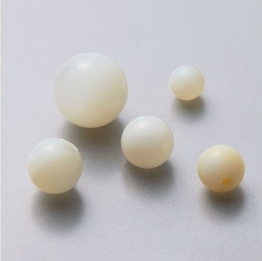 真珠貝の母貝を丸く磨き上げた「マザーオブパール」は、肌なじみのよいやさしい乳白色とナチュラルなむら感で、ひと粒ずつ異なる表情が楽しめるのが魅力です。
