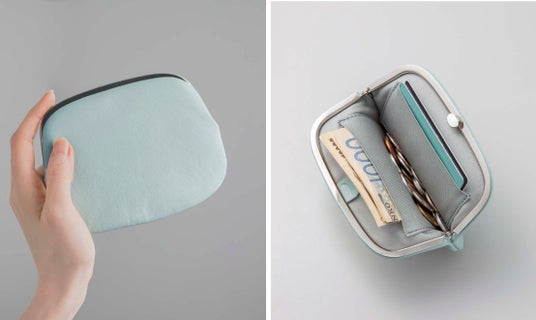 「天溝口金(てんみぞくちがね)」という、つまみのない口金のすっきりとしたフォルムが美しい「本革がま口財布」。この口金を仕立てる腕を持つ職人が少ない中、今回の商品はすべて日本の職人によってていねいに仕上げられています。キャッシュレス化が進む日々の暮らしにちょうどよい、「必要充分」なミニマルな仕様で、手にやさしくなじむように選んだふんわりと軽い本革の感触も魅力です。カラーはさわやかで装いのポイントにもなる〈ミントブル―〉と、落ち着いたあたたかみと大人の深みを感じる〈モカ〉の2種類です。