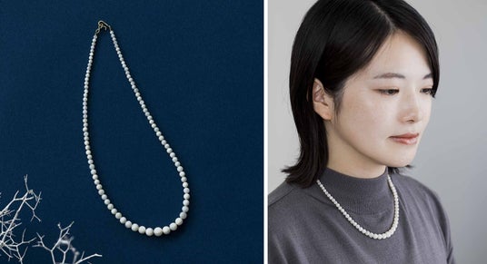 明治20年より主に欧米に向けてファッションアクセサリーを販売してきた松若硝子真珠工業所の倉庫から見つかった、30年以上昔のヴィンテージネックレス。グラデーション状に並んだ粒のサイズは、なんと約0.25mm単位で選別されていて、後ろから前へと流れるようなサイズ差になるように手作業で連ねられています。上質な輝きと、惜しみなく注がれた手間ひまに、古き良き時代を感じる逸品です。