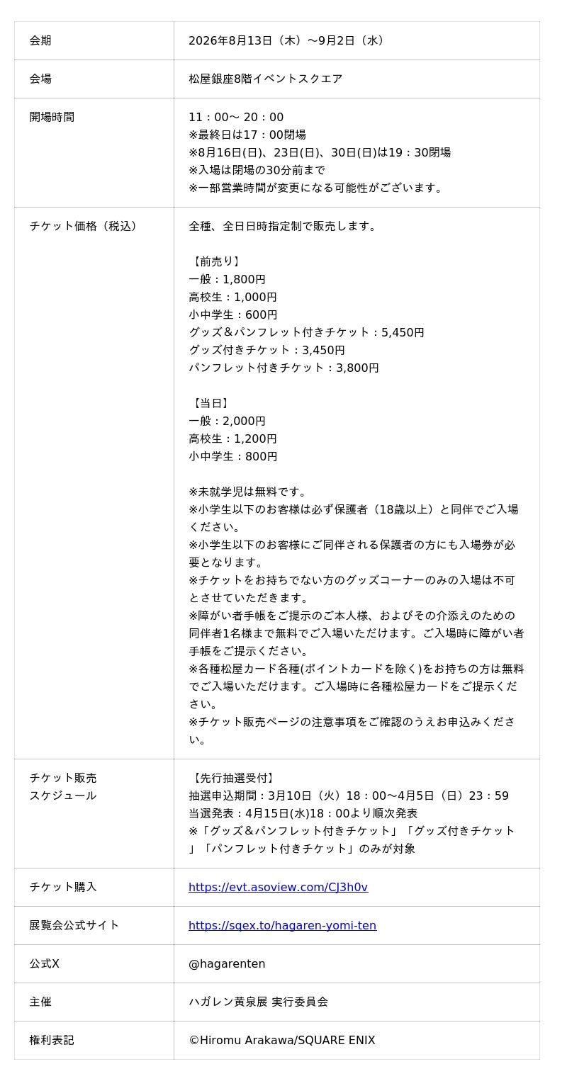 株式会社スクウェア・エニックス(本社:東京都新宿区、代表取締役社長:桐生 隆司)は、漫画家・荒川弘先生作の「鋼の錬金術師」の生誕25周年と、最新作「黄泉のツガイ」の生誕5周年という節目に、両作品の世界を存分に体感できる特別展『鋼の錬金術師×黄泉のツガイ展』を開催します。2026年8月13日(木)から開催される東京・松屋銀座を皮切りに、北海道、石川、大阪、愛知などで巡回展も実施します。
