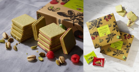 ピスタチオ風味のチョコレートとピスタチオクッキーのサンド「ピスタチオ&ピスタチオ」と、フランボワーズチョコレートをプラスした「ピスタチオ&フランボワーズ」のアソートセットです。