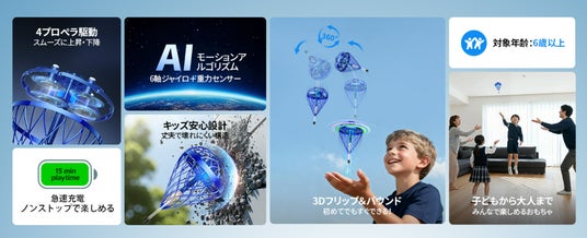 軽く投げるだけでふわっと浮かぶ「フロートモード」、手のひらで前に押し出せば家族や友達と遊べる「キャッチ&パス」モードに。さらに、底部のスプリングを手や足でタップすれば「バウンドプレイ」でテンポよく跳ね続け、コツをつかめば3Dフリップ回転も可能です。