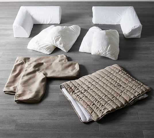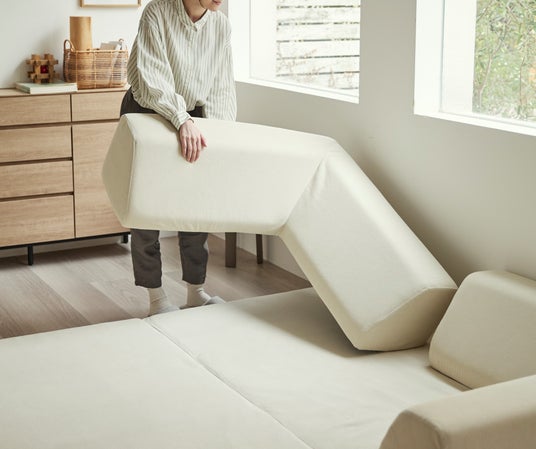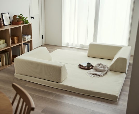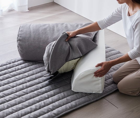 本商品は、二つ折りにできるラグマットと、2つの背もたれクッションの計3つのパーツで構成されています。背もたれクッションは底面に滑り止め加工がついていて置くだけの仕様なので、広げて使用するときには背もたれを隣同士に置いたり、向かい合わせに置いたりと、座りたい場所に合わせて、簡単にレイアウトを変更することが可能です。