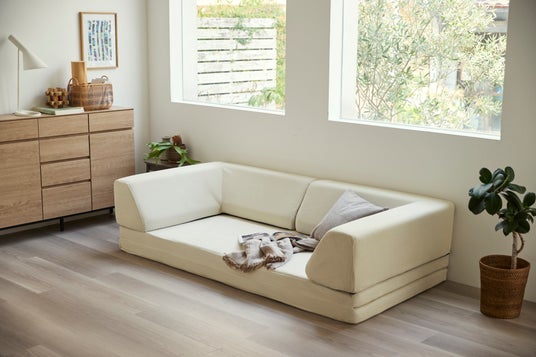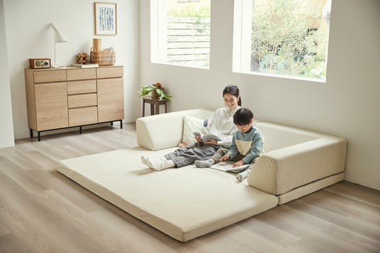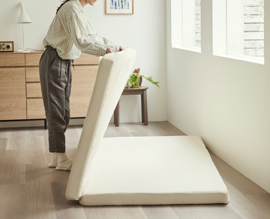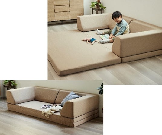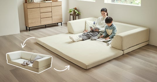 折りたためばローソファーになる「グータラグ」シリーズ初の2WAY仕様の商品です。子どもが遊ぶ昼間は広げてマットレス代わりに使用し、大人が寛ぐ夜はたたんでコンパクトにするなど、シーンに合わせて空間を有効活用できる点が特徴です。