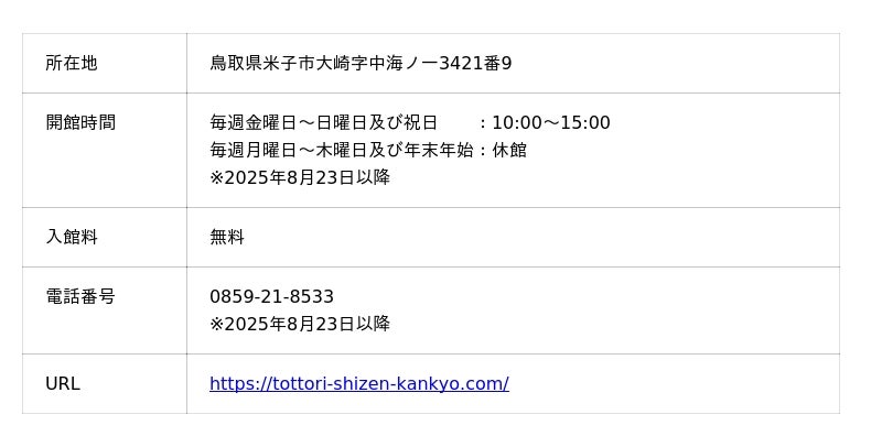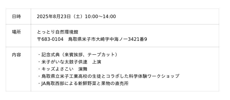 株式会社ユーラスエナジーホールディングス(本社:東京都千代田区、代表取締役社長:諏訪部 哲也、以下「当社」)のグループ会社である鳥取米子ソーラーパーク株式会社※1は、鳥取県米子市にて運営する「ユーラス鳥取米子ソーラーパーク」併設の「とっとり自然環境館」を、2025年8月23日(土)にリニューアルオープンします。当日は、リニューアルオープンを記念して、記念式典やイベントを開催します。