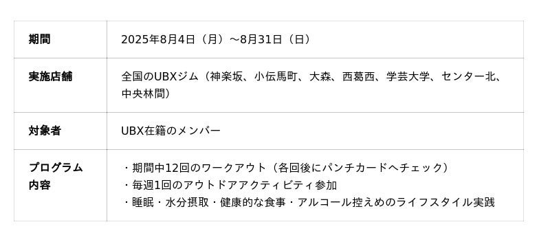 UBXは2025年8月4日から8月31日まで、【FIT 4 LIFE CHALLENGE】を開催いたします。【FIT 4 LIFE CHALLENGE】は世界全店舗で実施される、日常生活全体のクオリティ改善を目指すプログラムです。