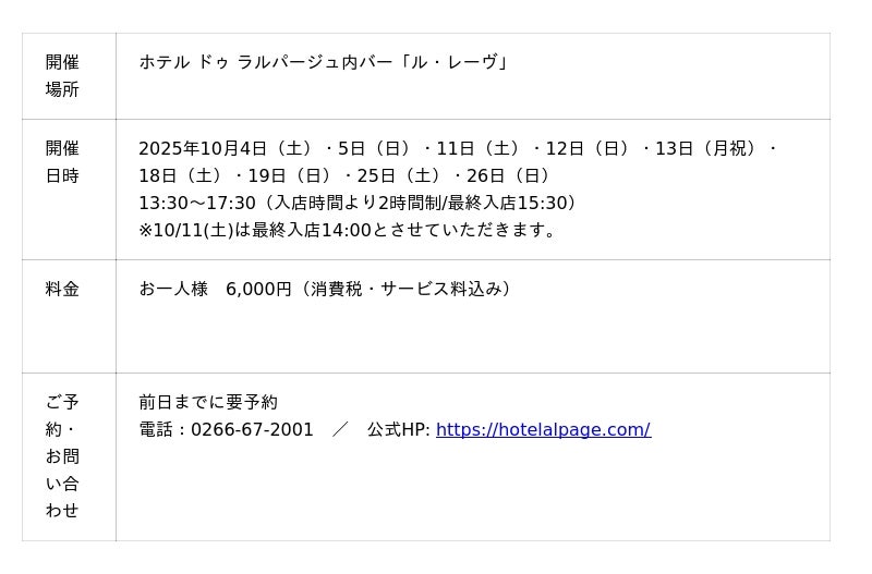長野・蓼科高原の「ホテル ドゥ ラルパージュ」では、実り豊かな季節にふさわしく、栗や洋梨など信州の旬食材をふんだんに取り入れたフランス式アフタヌーンティー「グーテ ドゥ ラルパージュ」を期間限定で提供いたします。都心より一足早く訪れる高原の秋を、ゆったりとしたティータイムとともにお楽しみいただけます。