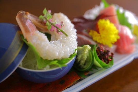 鮮やかに華ひらくお刺身は新鮮さの証。お客様の食事時間を合わせて調理するので直前まで生きた状態でいます。ご自身でおろしていただく本わさびを使用。