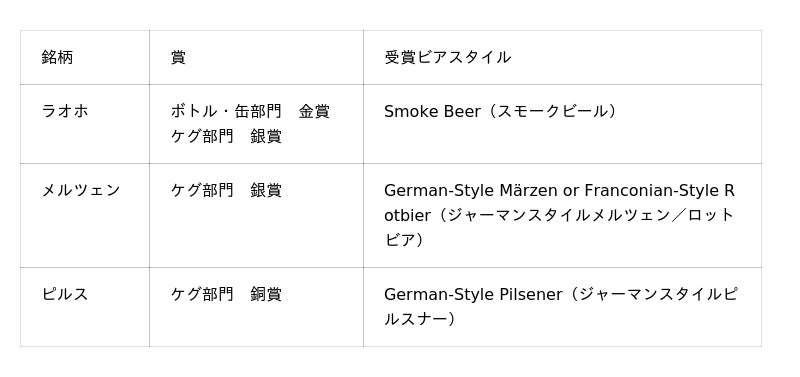 なかでも「ラオホ」は、ボトル・缶部門において、2年連続での「金賞」となりました。