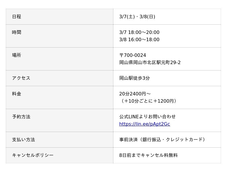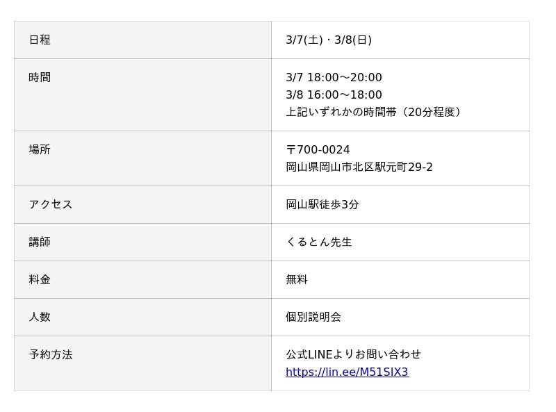 占い師養成CAMPの説明会と同時に、くるとん先生の対面鑑定も岡山で行います。すでにご予約いただきました方、誠にありがとうございます。くるとん先生が岡山で鑑定される貴重な機会になりますので、奮ってご参加ください。