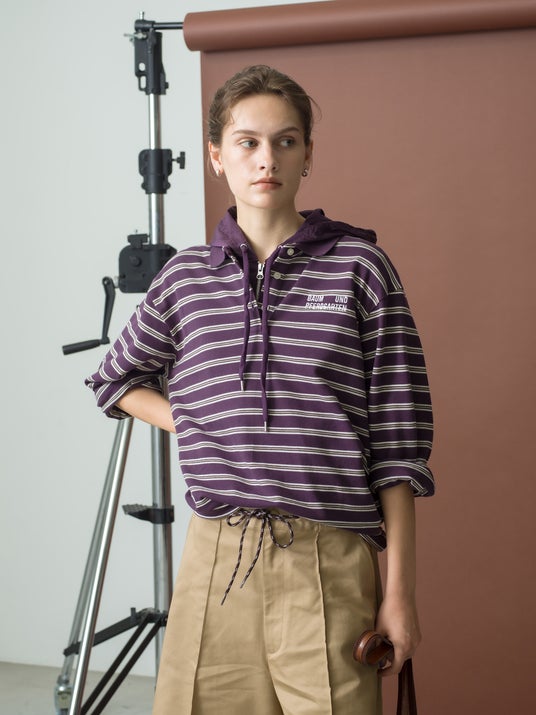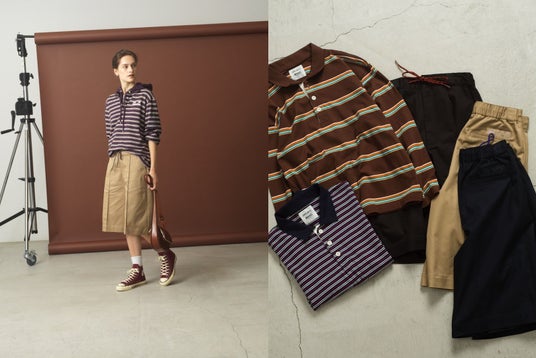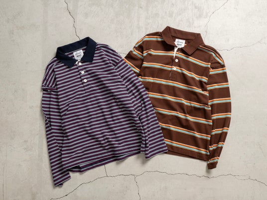 シャツは、90年代スタイルのラガーシャツの原型に近づけてオーダーし、マルチピッチのオリジナルボーダーのデザインに仕上げました。素材は、度目を詰めて打ち込み、張りを出し、大人な印象に。別注ハーフパンツとのファッション×スポーティな組み合わせがRHCらしい今季のムード。ヴィンテージライクなデザインがスタイリングのアクセントになります。