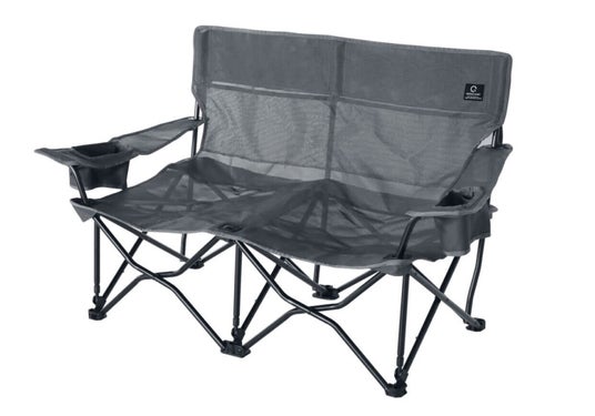 収束式の収納でコンパクトに持ち運べます。多機能なアームレストには、間仕切り付きの大容量ドリンクホルダーが付いており、使い勝手も抜群です。 ※下記二人掛けサイズと同仕様。