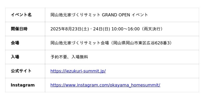 岡山の不動産会社ノマド株式会社(主催)と、WEBサイト制作やブランディング支援を行う株式会社クラビズが企画・運営を手掛ける、『岡山地元家づくりサミット』(岡山市東区広谷)が、いよいよ2025年8月23日(土)にグランドオープンします。